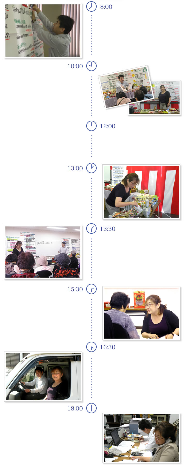事務所に戻って、当日の売上日報を作成し、明日の準備をして退社します。
